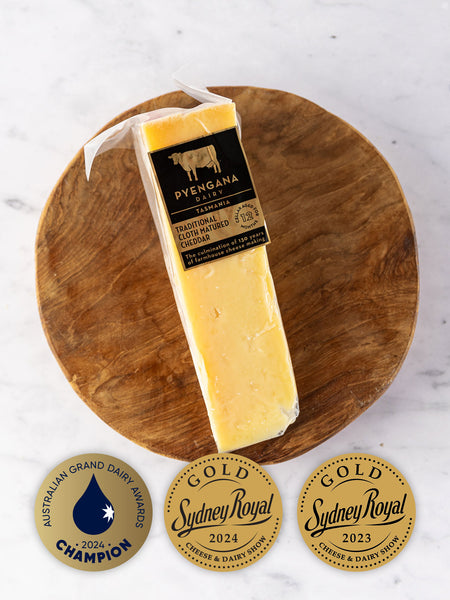 A multi-award winning cheddar cheese. Handcrafted using a recipe that is unique to Pyengana and has been perfected on farms in the valley over 130 years. Matured in a traditional cheese cloth in a cave like environment for approximately 12 months to develop a rich, bold flavour with earthy characteristics.
